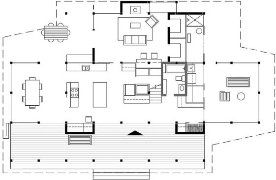 An expansive deck rests steps above grade obviating the need for view-blocking railings.
