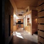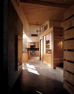 Interior materials include a variety of salvaged woods and sprayed earth plaster.