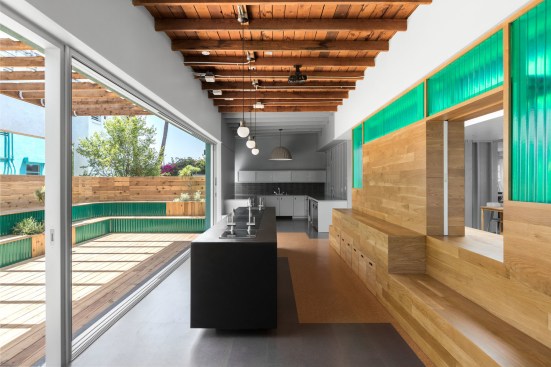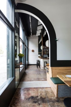 Repeating archways and sun motifs create continuity between juxtaposed dark and light seating areas of a Taiwanese soul food restaurant in the Mar Vista neighborhood of Los Angeles.