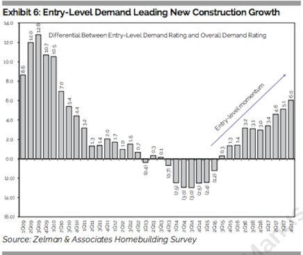 On a 0–100 scale, entry-level demand was rated 72.2, or 6.0 points above our proxy for all price points. That spread is the highest since 2Q10, which overlapped the expiration of the last home buyer tax credit. By year, the spread was worst in 2014, remained slightly negative in 2015 and then first turned positive in 2016.