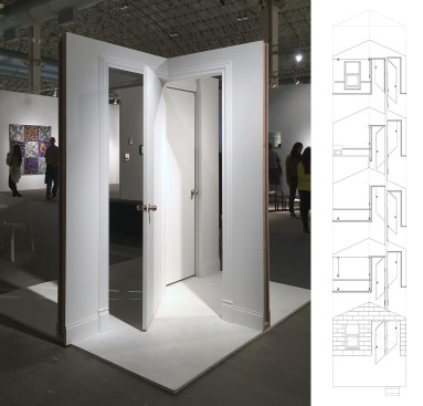 Shotgun House was a rehabilitation proposal for a vernacular building type to accommodate a workshop and gallery for an artist in one very small house. We proposed an enfilade plan with eight rooms separated only by doors set into double-frames. As a door closed one room, it inadvertently opened another. This conundrum offered endless possibilities for molding that folded in and out of every corner of the doorjamb.