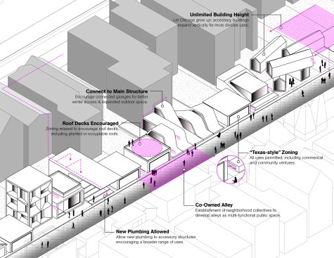 First displayed at the 2016 “50 Designers, 50 Ideas, 50 Wards” exhibition at the Chicago Architecture Center, the firm’s Rebel Garages research conceives a city alleyway as an alternative community space.