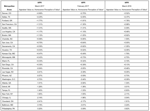 Home values continued to rise in March, but not at the pace homeowners estimated across much of the country. On average appraisals were 1.77% lower than what homeowners expected, according to the Quicken Loans Home Price Perception Index (HPPI). This marks the fourth consecutive month the gap between homeowner estimates and appraiser opinions of value widened.