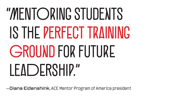Opportunities to mentor can spark inspiration at any career stage. “Even when a student thinks they know what an architect does, they usually don’t,” says Diana Eidenshink, president of ACE Mentor Program of America, a free, after-school initiative designed to attract underserved high school students to careers in architecture, construction, and engineering through mentorships and hands-on leadership training. “Most of our mentors are emerging professionals,” she says. “Skills to be a good leader are the same skills needed to be a good mentor. Mentoring students is the perfect training ground for future leadership.”