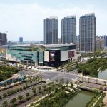 The mall weds Qianjiang’s resort past with its urban future through aesthetic choices that include an undulating façade mirroring the nearby Qiantang River and a rooftop park with river views and a landscaped connection to residential, hotel, and office towers.