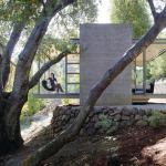 Earthbound concrete towers let the transparent boxes perch delicately above the site.