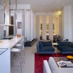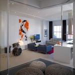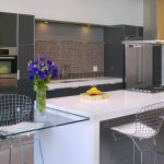 “In all of our projects, we like to manipulate standard materials to make them unique,” Beauter adds. “Here, we utilized standard basic doors and hardware and made them custom without a tremendous amount of cost or effort.” In addition to the movable panels and disappearing guest bed, Mullen-Carey and Beauter looked for other ways to increase flexibility. The kitchen island, for example, conceals an extendable glass dining table. A slab of tempered glass rests just below the solid-surface countertop and slides in or out to the desired length. A single stainless steel leg supports the floating end and sits flush against the island when the table is fully retracted. “Everything you see has an ability to function,” Mullen-Carey says, “but also allows the romance of how a loft should feel to read through the functionality.”