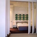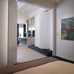 The panels operate manually using off-the-shelf hanging door hardware. The floor and ceiling tracks were installed as a single system that continues around the two bedrooms. The nonstop tacking allows for myriad panel configurations and creates a cool detail. “There’s this sleek snaking line around these spaces,” Beauter explains, “so it gives a sense of separation even when the doors are open.”