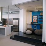 Beauter and Mullen-Cary also devised clever ways to increase the usefulness of the guest bedroom. Concealing the bed beneath a raised floor allows the space to double as a home office or even overflow entertainment space when the panels are pushed aside. Hydraulic lifts beneath the wood floor raise the bed into position. Fashion-conscious beanbags conceal the mechanism’s door and transform the room into an intimate lounge, while a wrap-around step offers more casual seating. “We liked the idea of being perched a little higher so people could hang out in a special space and get a new perspective,” Mullen-Carey says.