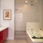 The design team brainstormed a way to keep the loft’s airiness while inserting enclosed rooms. After researching several divider alternatives they designed a custom partition system with panels that slide fully open or close tight, but also tilt at various angles. The 10-foot-tall panels provide occupants with several options for privacy or connectedness. To create the system, solid-core doors were sliced into segments and reconfigured into long, narrow panels. The height is nearly two-doors tall while the width is approximately half that of a standard interior door. The dimensions are elegant and dramatic, plus the panels are heavy to help buffer sound, according to Beauter. When designing in tight quarters “you have to make the solution simple but inspiring or it will overpower the space,” Mullen-Carey surmises. “The star of this show is the movable partition system—simple, elegant, and really classic in a modernist way.”