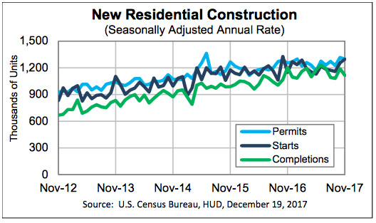 Single-family housing starts in November were up 5.3 percent from October to a rate of 930,000, 13 percent ahead of November 2016. Multifamily was up marginally on a sequential basis to a rate of 359,000 units.