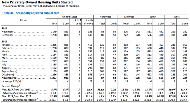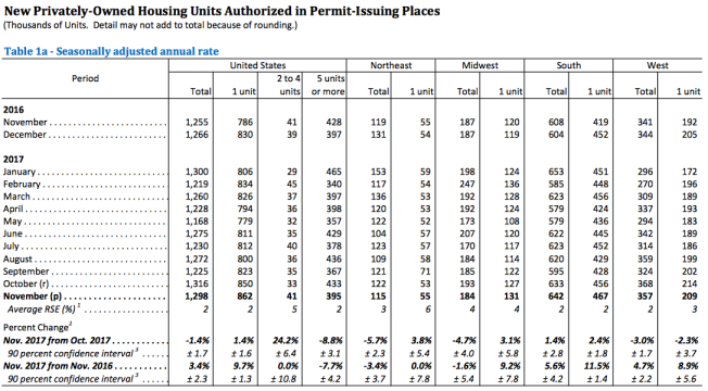 Building permits in November were at a seasonally adjusted annual rate of 1,298,000, down 1.4 percent from the revised October rate of 1,316,000 but 3.4 percent above the November 2016 rate of 1,255,000. Single-family authorizations in November were at a rate of 862,000, 1.4 percent above the revised October figure of 850,000 and 9.7 percent ahead of the pace of November 2016. Authorizations of units in buildings with five units or more were at a rate of 395,000 in November, down 8.8 percent from October and 7.7 percent from a year earlier.