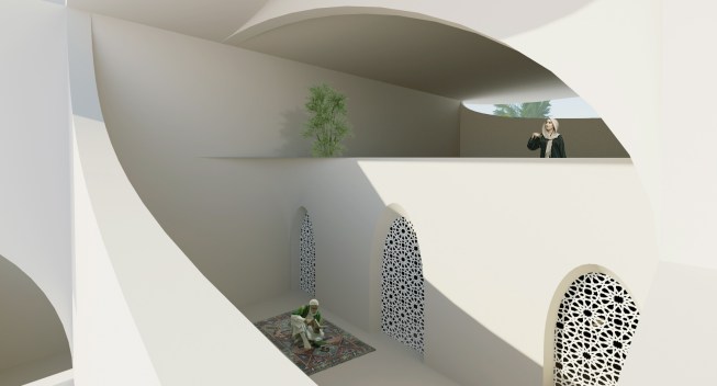 The Housing for Regrowth affordable housing prototype is designed for refugees returning to Mosul, Iraq. The structure incorporates vernacular and modular elements to create repeating leaf-like apertures, some of which lead to private courtyards.
