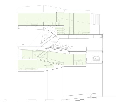 This proposal for a 54-unit housing complex in Boston features continuous ramps that elevate parking and living spaces above street-level pedestrian areas.