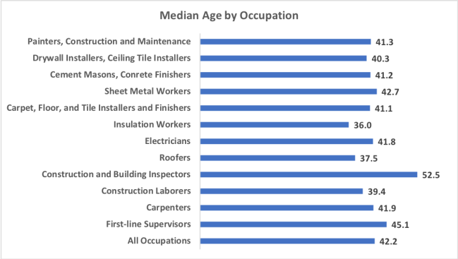 A closer look at the data shows that several builder-specific fields have a higher median age than the national median. The median age of construction and building inspectors is 52.5 years old, and the median age of first-line supervisors is 45.1 years old. The BLS estimates there are 59,000 more first-line supervisors between the ages of 45 to 54 than 25 to 34.