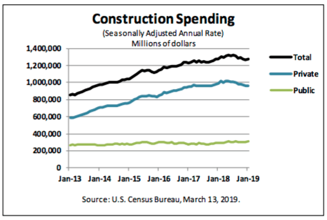 Construction spending during January 2019 was estimated at a seasonally adjusted annual rate of $1,279.6 billion, 1.3% above the revised December estimate of $1,263.1 billion and 0.3% above the January 2018 estimate of $1,276.3 billion, the Census Bureau reported Wednesday.