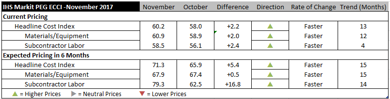 Construction costs rose again in November, according to IHS Markit and the Procurement Executives Group (PEG).