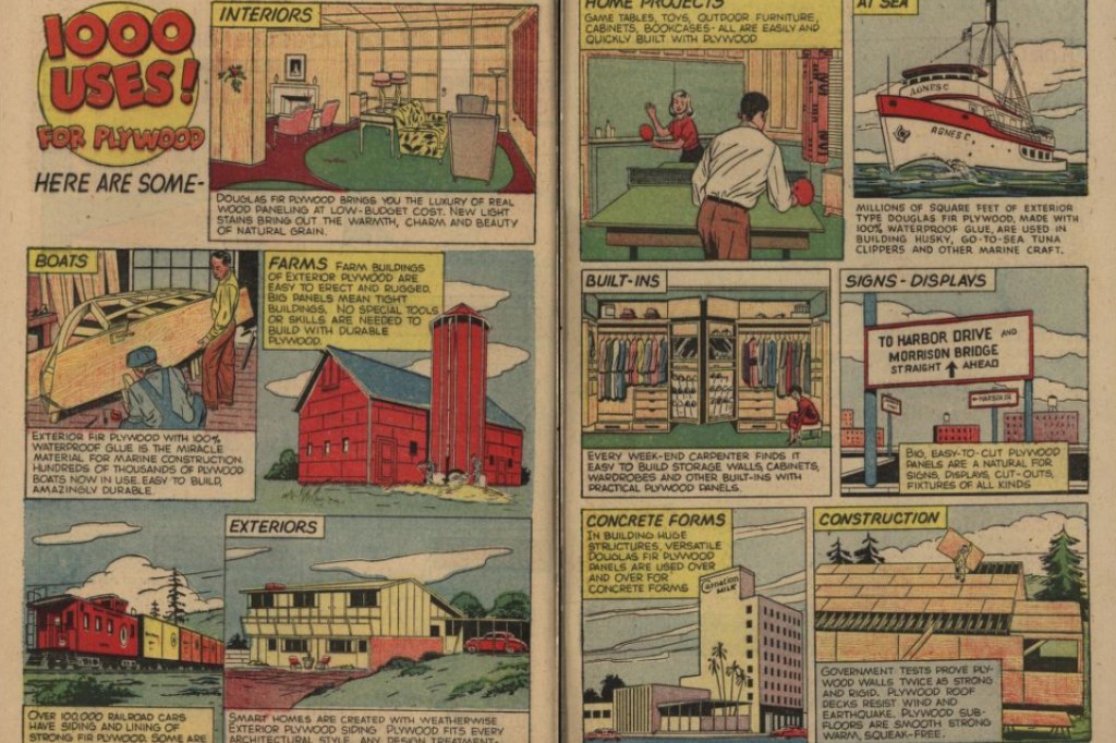 This tongue-in-cheek publication by the Douglas Fir Plywood Association details the history of the material in comic book form.