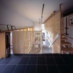 The stair combines massive timber elements with a slatted screen that seems to float above the floor.