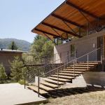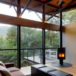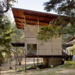 A similar roof tops the two-story guesthouse, whose upper level shares the floor elevation of the main house. “It has a living room upstairs and bedrooms downstairs,” Schuh says, “but they’re not connected inside,” an arrangement that allows the guest living area, with its small kitchen, to serve also as an overflow living space for the main house. Despite their close connection, however, the two structures offer subtly different experiences of the site. The main house is grounded by its board-formed foundation walls, which extend outward from the building to become site retaining walls. In contrast, the guesthouse perches lightly on a scaffoldlike steel framework. As the building rises into the forest canopy, Schuh says, “the site just flows through underneath.”