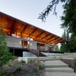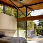 Schuh’s clients, a couple embarking on post-retirement life, envisioned a casual mode for their new home. “This was to be their transition from living in the city, a place where they could just relax and absorb the setting,” Schuh says. To accommodate frequent visitors without cramping the open-plan lifestyle they sought, Schuh divided the program into two separate structures—a main house and a guesthouse—linked by a linear deck that runs the length of both buildings. “The grade drops off dramatically,” he says, “so the deck can bridge to the guest house. It’s this spine that holds things together.”