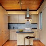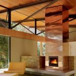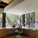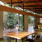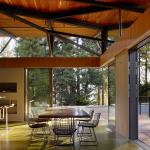 Schuh heightened the tree house atmosphere inside with a shed roof that floats over a tall, glazed clerestory. Tubular steel struts shorten the effective span of the rafters, which also benefit from the cantilever effect of the roof’s 12-foot overhang, permitting the use of relatively small 6-inch-deep, wide-flange I-beams. “We used steel because we wanted to keep the framework as light and airy as possible,” Schuh says. Laminated fir decking boards span the 8-foot bays without purlins, “so we were able to keep the roof profile really thin.” And while the ceiling plane’s skyward trajectory draws one’s gaze out into the treetops, the roof structure asserts its own sculptural presence. “Most of the walls don’t go up to the main roof—just two interior walls do—so there’s always this sense of it hovering over the space,” Schuh says.