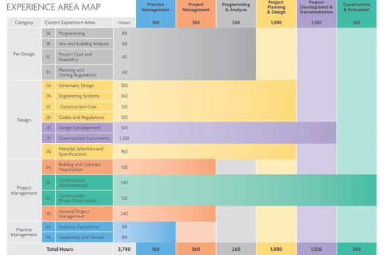 The announcement comes less than a month after NCARB renamed its Intern Development Program to the Architectural Experience Program (AXP), a semantic shift that addresses a recent push to stop use of the word “intern” in describing unlicensed professionals, particularly those who are working toward licensure. This follows a revision to the now-AXP, then-IDP announced in November that cuts the original 17 core experience areas required in the program down to six, which correspond to ARE 5.0’s test sections (shown above): practice management, project management, programming and analysis, project planning and design, project development and documentation, and construction and evaluation. NCARB also eliminated candidates’ need to earn 1,860 elective hours, bringing the total experience time down to 3,740 hours.