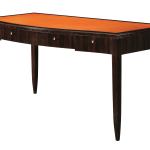 The Sydney writing desk features an orange leather top and ebony veneer. It is 62 inches wide, 30 inches tall, and 31 inches deep.