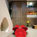 The restoration architects, however, import materials that are slick and commercial. The dropped ceiling panel system is completely out of character with the original, its low-gloss, vinyl-looking surface at odds with the concrete. The panels, actually made of metal, now take the ceiling out of Rudolph’s highly material 3-D surround, denaturing the concrete lid in a jarring tonal lapse. Similarly, wooden floors, raised to the level of the surrounding concrete terraces, domesticate the spaces and reverse the spatial differentiation defined by the level changes. Gwathmey Siegel replaced Rudolph’s hemp curtains with neat but bland roll-down shades.