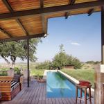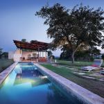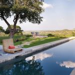 Those effects are amplified by a planting design that blends in with the big picture: a swath of drought-tolerant zoysia turf where the grandchildren play, and a sea of native grasses that move with the wind. The pool interior, too, is covered in sandy-colored plaster that evokes the limestone bottom of the region’s rivers and creeks. All these gestures defer to the land, while rendering a formerly inhospitable site relevant again.