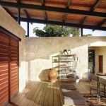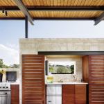 Years ago, the spot had been marked informally with a fire pit and vintage Airstream trailer, smartly remodeled, that sat in the hot sun. “They thought we should pull the trailer away, but we said, ‘We love it, let’s design for it,’” says project architect Karla Greer. The new pool pavilion is composed of three simple elements whose materials echo those on the main house: ipe decking, an open steel superstructure with a roof that tips up to the south, and two thick Texas limestone boxes that run perpendicular to each other, blocking the summer sun and winter’s northwesterly winds. The smaller masonry volume holds a full kitchen and media center, both of which can be closed off with slatted Western red cedar doors. “The owners are huge cooks,” says Greer, so kitchen fittings are deluxe, including a Viking grill, a wok cooker, an oven, and a dishwasher. The larger box houses an indoor-outdoor bathroom, laundry, and storage. Through an opening is the Airstream, shaded by oaks. It sits under an arbor and was given a new deck. “The trailer was remodeled years ago with old longleaf pine floors and decorated with leather, and looks like something Ralph Lauren would have worked on,” Greer says. “But no one seemed to want to go there.”