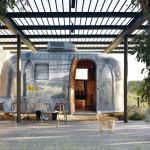 With the fully equipped Airstream nearby, the pool house has evolved as another guesthouse, minus the walls, windows, and doors. The living area contains a custom furniture piece that invites lounging, naps, and nights under the stars. “When the couple is here, they use this space actively,” Greer says. “With so little light from any town, there are fabulous views of the stars.”