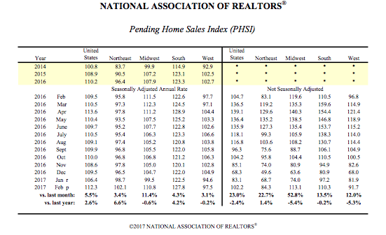 The PHSI in the Northeast rose 3.4% to 102.1 in February, 6.6% above a year ago. In the Midwest the index jumped 11.4% to 110.8 in February but is still 0.6% lower than February 2016. Pending home sales in the South climbed 4.3% to an index of 127.8 in February and are now 4.2% above last February. The index in the West increased 3.1% in February to 97.5, but is still 0.2% higher than a year ago.