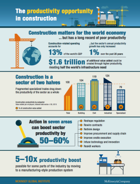 A recent analysis by the research arm of worldwide management consultants McKinsey & Company confirms your hunch and explains why productivity is notoriously and consistently poor. But the question of how to invert the downward trajectory has remained more or less unanswered – until now. “Reinventing Construction” identifies seven strategies that, if executed collectively, in unison across the sector, could put $1.6 trillion back into the global economy by increasing productivity 50% to 60%.