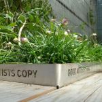 Custom stainless steel planters fabricated by Shift_Design contain laser-cut quotes.