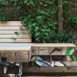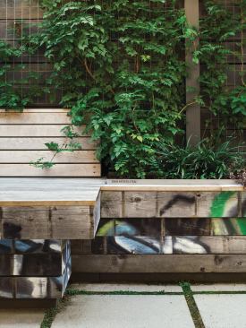 Pieces of graffiti-covered wood, salvaged from an old water tower, clad the bases of the built-in benches.