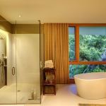 A bathroom measuring less than 100 square feet is transformed into a spa-like retreat that takes full advantage of the site’s Marin Headlands views. Architect: Jason Langkammerer, At-Six Architecture; Builder: Rafael Rodriquez, Raff’s Construction