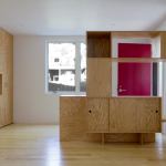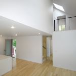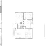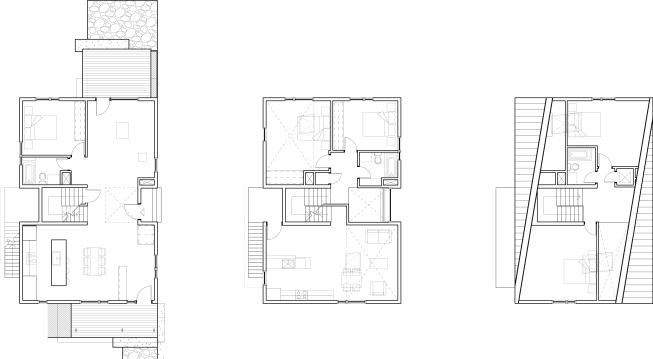 Reflecting the scale of nearby homes, the pitched-roof building fits into the neighborhood nicely. A main street-facing entrance leads to the first-floor owner’s residence, while a side staircase leads to the second floor rental. “The sections reveal that the second floor is split—half for the owner and half for the tenant,” Crosby explains. “The third floor is [also] for the tenant.” The configuration, Crosby continues, results in light-filled double-height spaces that make the home seem bigger.