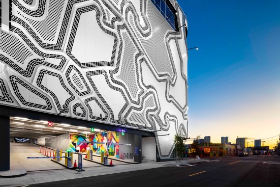 Although Faulders Studio is not a façade consultancy in the traditional sense, the office continues to push the expressive potential of the building envelope, most recently with Wynwood Garage façade in Miami. Designed by local firm Wolfberg Alvarez & Partners Architecture, the 250,000-square-foot, eight-story parking garage includes ground-level retail and a single level of commercial offices at top. Located within Miami’s Wynwood Arts District, a creative destination known for its street art collection, the Wynwood Garage possesses ample surface area for making a dramatic statement in dialogue with its context. Given the commission to design the building’s façade, Faulders created a visually striking urban canvas with perforated aluminum panels. A high-contrast pattern vaguely reminiscent of soap bubbles contained within a box (although more angular and distorted) connects the building’s many floors while obscuring the individual parking levels from the outside. Thin aluminum panels protrude from the seams between the “bubbles,” adding visual depth to the surface.