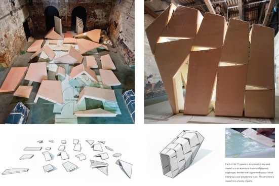 Exhibited at the 2012 Venice Architecture Biennale, the About Face installation is a proposal for residences in Detroit that reorients existing structures and makes use of vacant lots. The structure comprises 21 fiber-reinforced resin panels that act as both a room and a staircase.