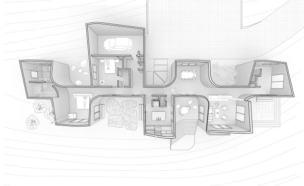 This undulating residence in the Blue Ridge Mountains of Virginia features rooms with alternating uphill and downhill orientations that allow for 360-degree views of the surrounding landscape.