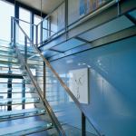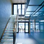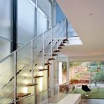 The glass stair doubles as artwork in the house's central gallery. Its reflective translucency scoops light into the deepest part of the structure, and a steel rod suspension system eliminates obtrusive columns.
