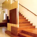 CUSTOM HOME January-February 2010 Last Detail Under Appreciation Architect Cathi House relied on rugged, exquisitely detailed woods to bring her staircase design to life. The dark red of Santos mahogany graces the steps and cutout accents. The staircase's underside is fashioned primarily from golden anigre.