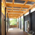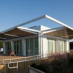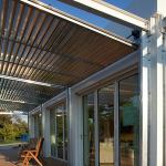 The louvers along the roof line and the east-facing screens are fixed at the calculated angle of 37.5 degrees for maximum shading from the high summer sun and optimal capture of low winter rays.