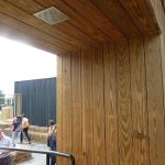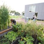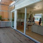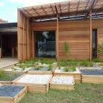 The spacious deck with its built-in seating, biofiltration beds, and vegetable gardens nearly doubles the interior foot print.