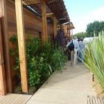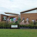 Visitors walk past a wetlands garden to reach the concealed cour…