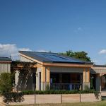 The vertical installation of collection panels for the solar hot water system encloses the entry space to all but one view.