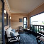 Shaded by bifacial solar panels that collect reflective light from underneath as well as direct sunlight that shines above, the OMs can be configured in various ways to provide protection from harsh mountain weather while still allowing cool breezes or warming winter sun to maintain pleasant conditions on the porch as well as inside the main house.