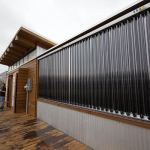 The sliding custom louvers are light and easy to move from deck shading to interior protection positions. In addition to hurricane fortifications, the panels also offer privacy or cool coverage for the translucent window walls.