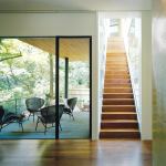 A rainscreen cladding of Brazilian redwood provides a textural contrast with the glass-enclosed staircase.